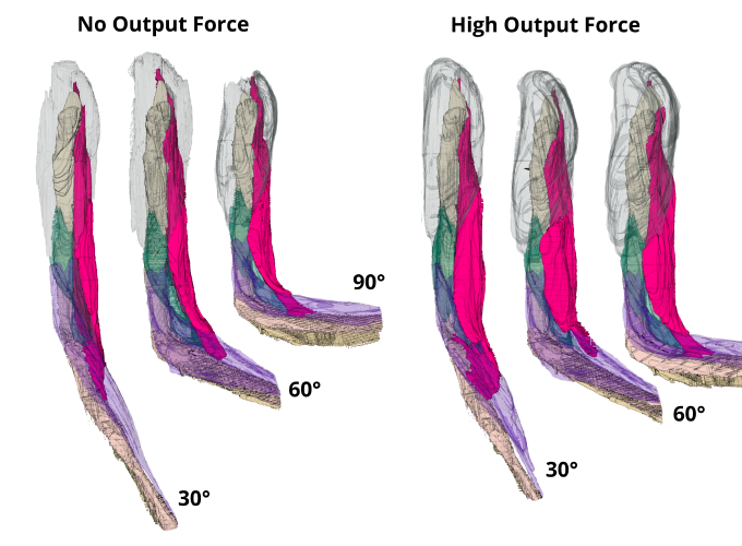 Left: Ultrasound and motion capture are combined to generate full 3D images of arm musculature. Right: 3D renderings of arm musculature show significant deformation under changes in elbow angle and force output.